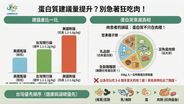 當然基於飽和脂肪限制及愛地球/減少溫室氣體排放,國人蛋白質食物優先順序仍請把握 (黃、黑)豆-魚-蛋-肉 順位 。