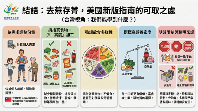 台灣飲食指南是根據台灣常用食物、烹調方式(例如中式烹調多熱炒)和飲食習慣、國民營養健康調查結果(例如國人易欠缺營養素),也納入聯合國永續發展目標(節能減碳)精神,我們不須一味仿美 。