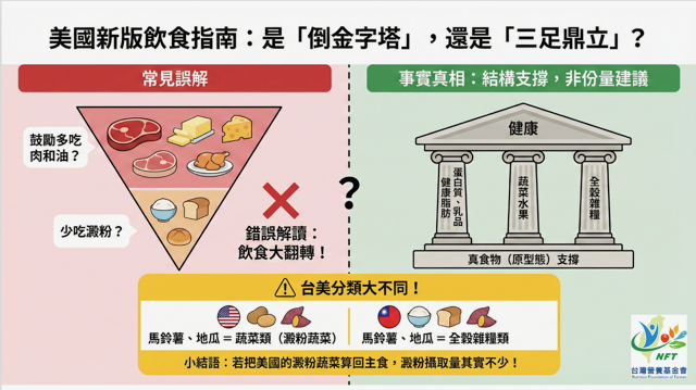 美國日前公布了最新的飲食指南 (2025-2030 DGA),其內容與圖像在網路上引發許多討論與解讀。然而,許多直觀的解讀並非指南原意。針對外界常見的誤解,台灣營養基金會在此進行專業釐清,並結合台灣的飲食環境,提供國人正確的參考方向 。